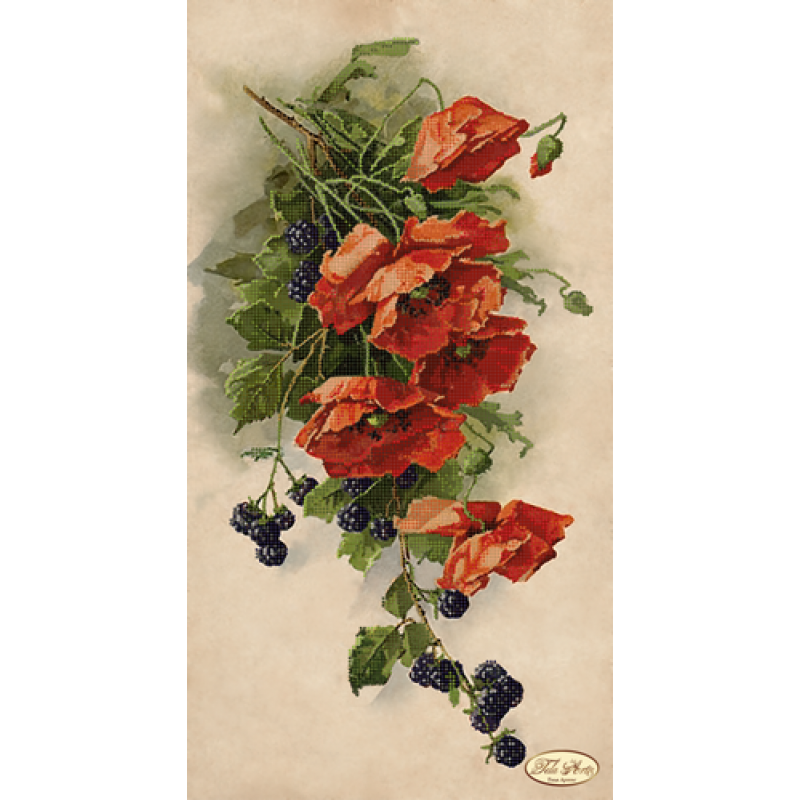 Hanging Red Poppies with Blackberries, size 24 x 44.5 cm, kit contains 9,000 beads in 16 colours, needle, thread and canvas. Hand made bead art is crafted to perfection to allow you to create a unique work of art. The canvas is marked with the position and colour of individual beads, and the picture is created by sewing beads onto the canvas using a half cross stitch method. Beads are sourced directly from Preciosa.